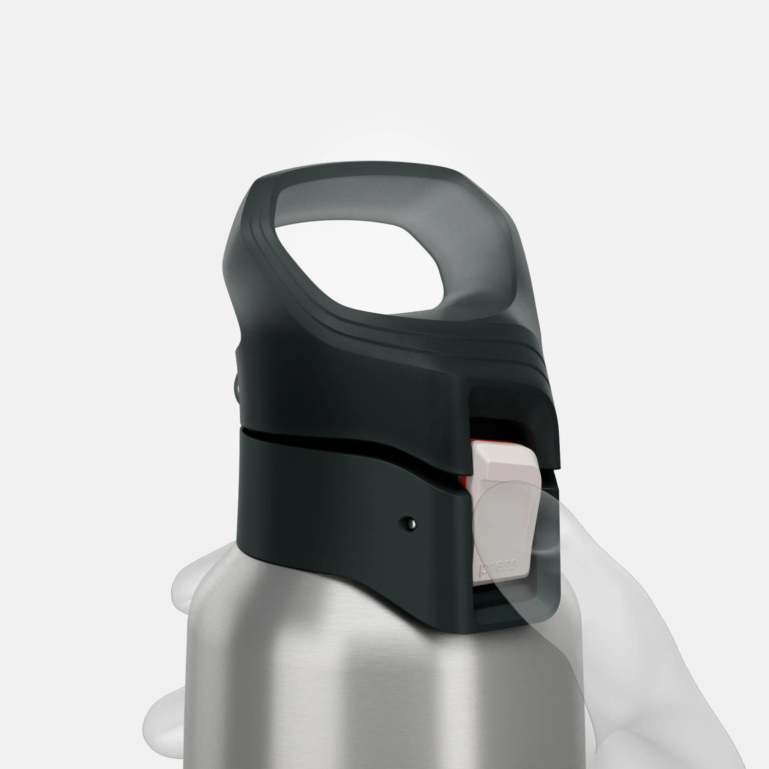 The top is easy to open with one hand by pressing on the white button marked “PRESS”. When carrying the flask, you can lock this button by sliding the white button down. A red area appears, indicating that the top is locked and it can no longer be pressed.